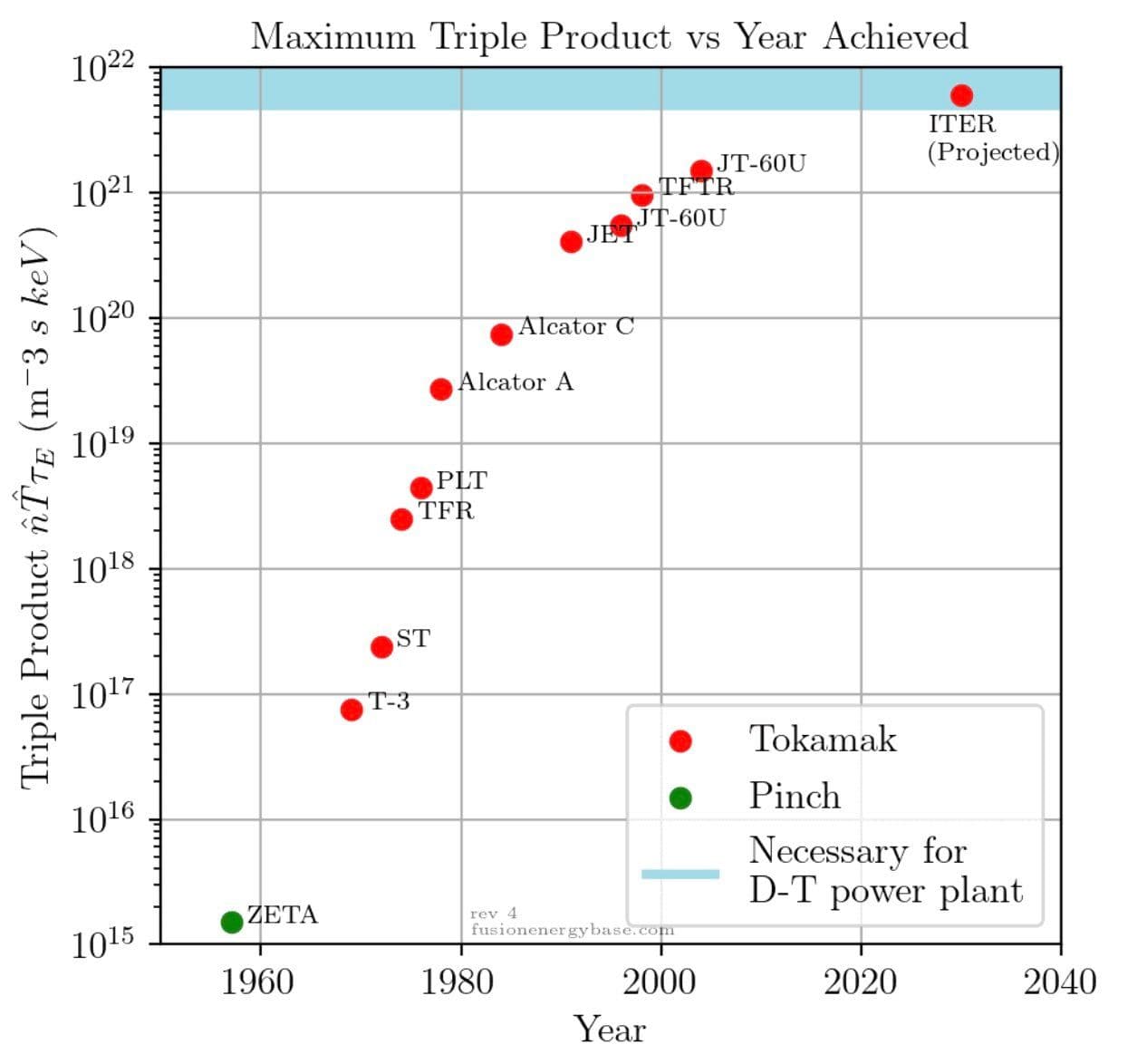 The old joke about fusion is “it’s 30 years away…and it always will be”. This is not true anymore due to spectacular progress in the field over the past decades - I believe it is now likely we will see the first fusion power plants connected to the grid in the 2030s. This graph shows the progress towards the conditions required for a fusion power plant over time: