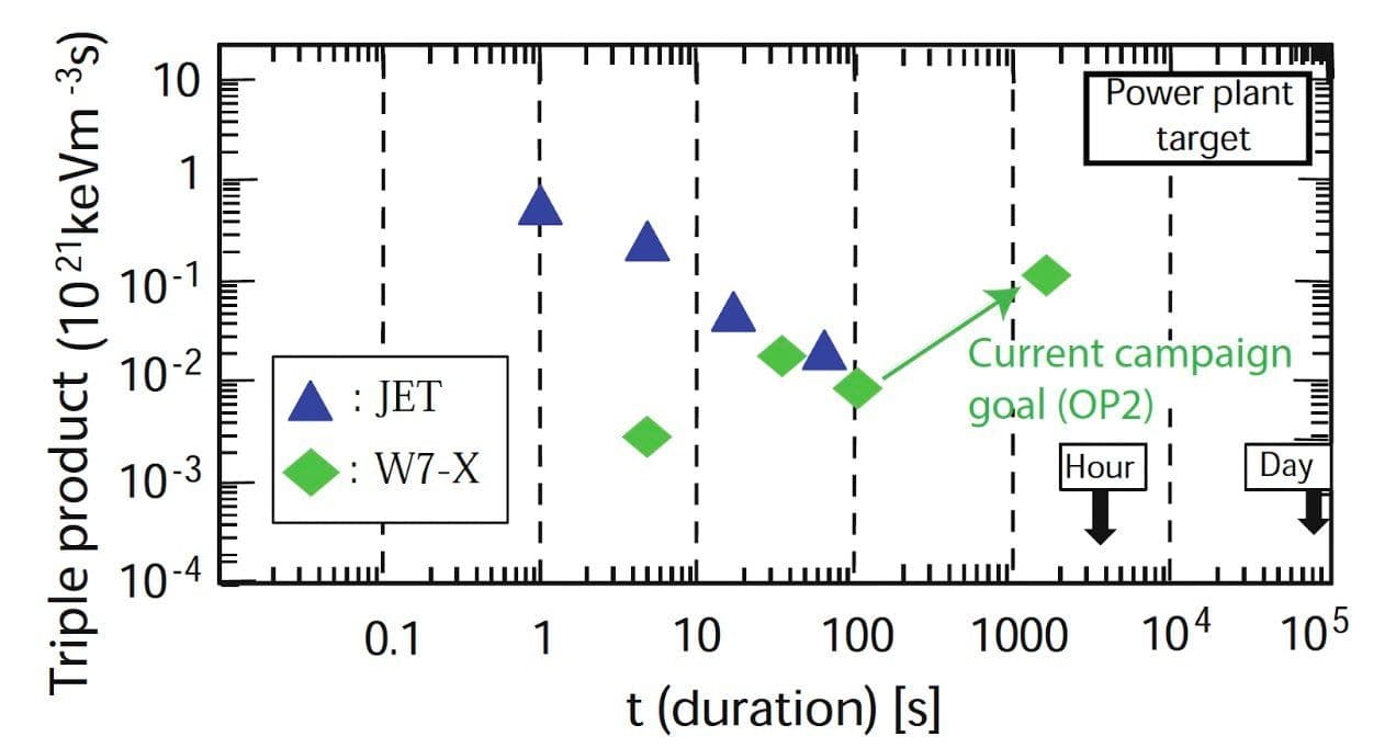 Stellarators, whilst harder to design, are radically easier to operate. They do not suffer from disruptions and can be run for much longer than tokamaks allowing them to achieve remarkable new performance records. This graph shows two key attributes of magnetic confinement fusion, the triple product (a good measure of how close a fusion reactor is to net power output) and the maximum confinement time achieved at this triple product (longer confinement is both a desirable engineering achievement and allows for higher output from a power plant):